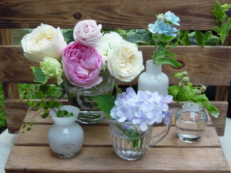 いろんな形のグラスといろんな花、葉っぱでナチュラルに。 |